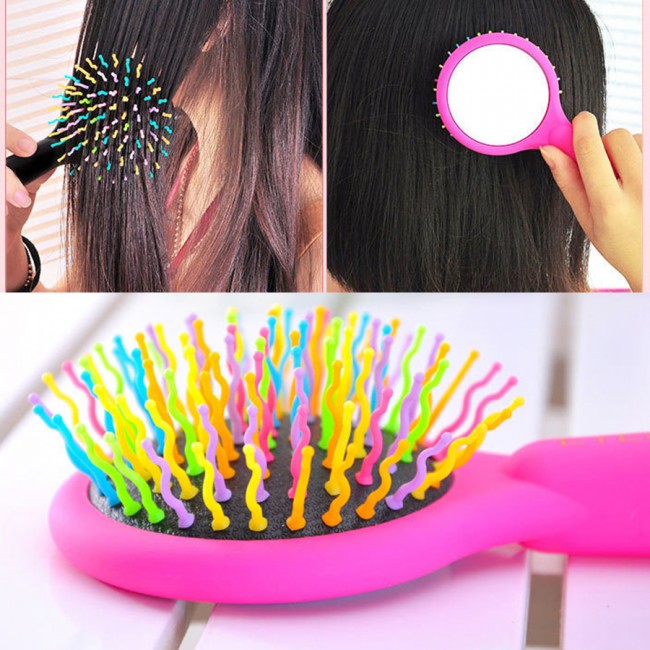 Секрет легкого розчісування від Rainbow Volume Brush - викривлені пластикові зубчики s-образної фор ми, які дбайливо розплутують волосся (як сухі, так і мокрі), не травмуючи шкіру голови. При розчісуванні вони створюють повітряний простір, завдяки якому волосся стає не тільки гладкими, але і об'ємними. Гребінець дуже зручно лежить в руці, ручка має гладку приємну на дотик структуру «soft touch», а ззаду є невеличке дзеркальце, що дуже зручно в повсякденному житті.