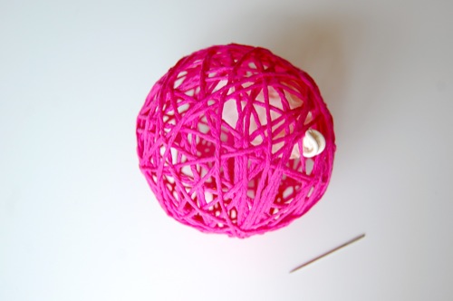 Крок 6: Коли куля застигне, пальцями відокремте його від ниток через просвіти. Після цього проколіть його голкою і акуратно, щоб не деформувати форму, дістаньте кульку з утворився «каркаса» з ниток.