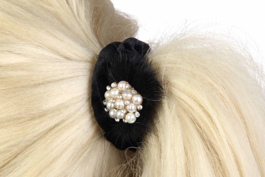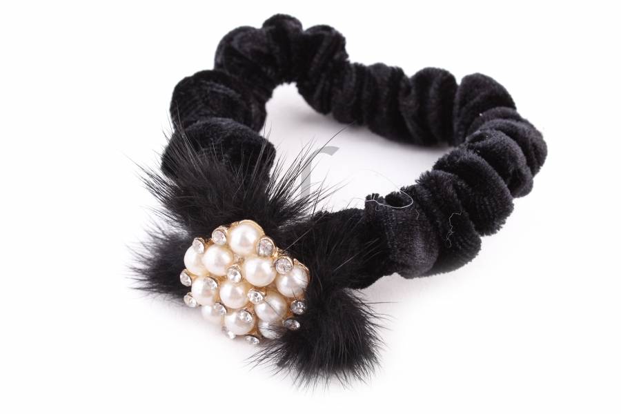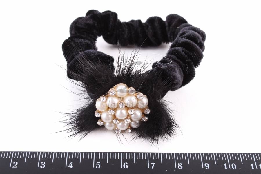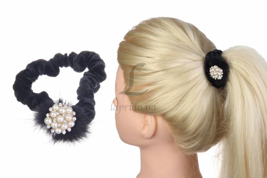 Резинка для волосся вельветова зі стразами і опушкою (чорна)